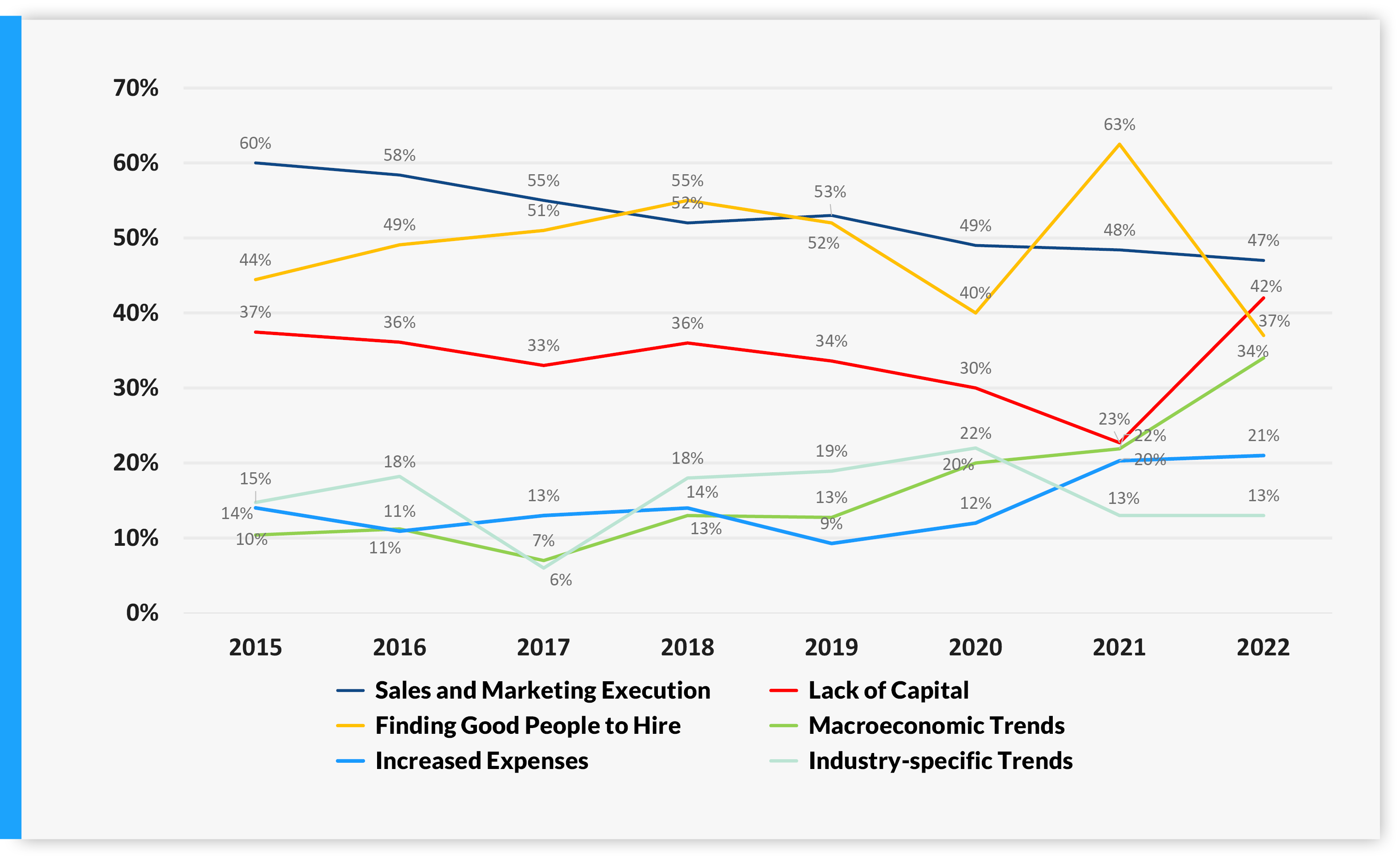 This year’s survey saw some of the most dramatic one-year shifts when it comes to the challenges founders are expecting for growing their business in the coming year.