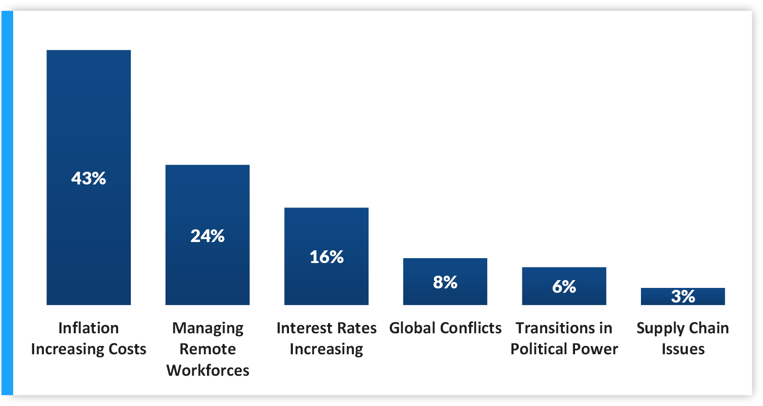 This year, Mainsail wanted to better understand how founders were expecting macro dynamics to impact their businesses. Inflation (43%), Managing Remote Workforces (24%) and Rising Interest Rates (16%) all topped the list of macro factors that founders expected to impact their businesses.