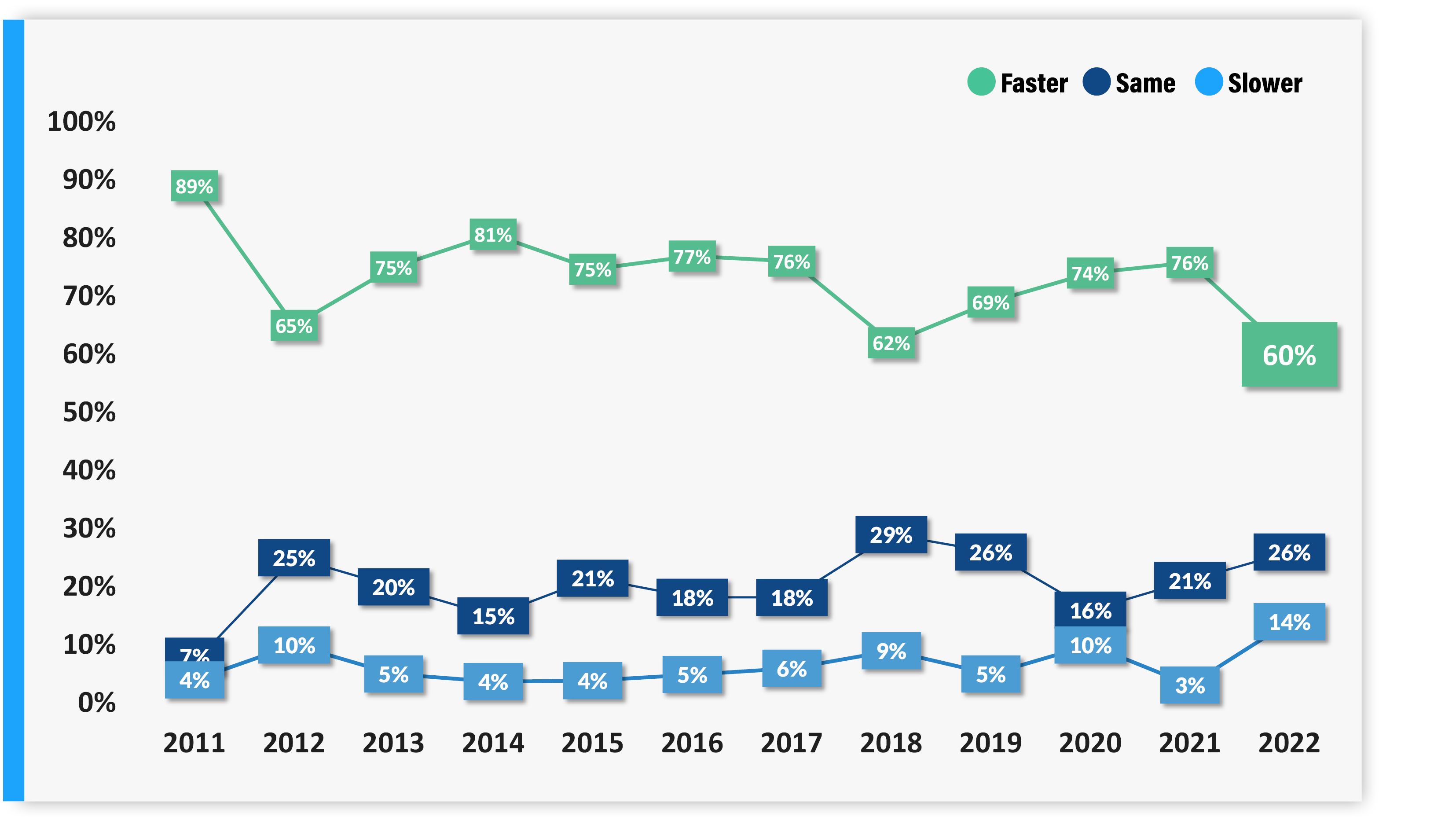 Founders, who are typically optimistic about their own businesses, were also less confident than usual, with only 60% believing their business will grow faster next year. While this represents the majority of respondents, it is a considerably smaller majority when compared to prior years’ average of 74% of founders expecting to grow faster in the coming year.