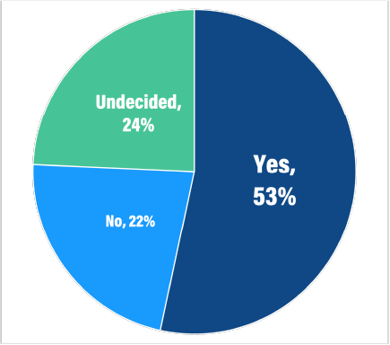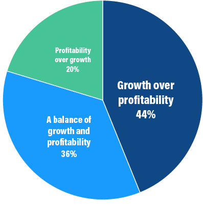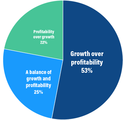 There are numerous data points that indicate technology company investors and buyers are no longer valuing growth the way they have over the past decade and are instead emphasizing profitability. While this year’s survey results show that 44% of respondents are still focused on growth over profitability, this is down from 53% when we asked the same question just two years ago. This indicates that the “growth at all costs” mindset is dimming as companies seek to strike a balance.