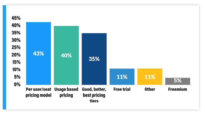 The most common pricing models cited in the survey included “Per user/seat pricing model” (43%), “Usage based pricing” (40%) and “Good, better, best pricing tiers” (35%). Note, these are not mutually exclusive and many survey respondents implement a combination of components in their pricing model.