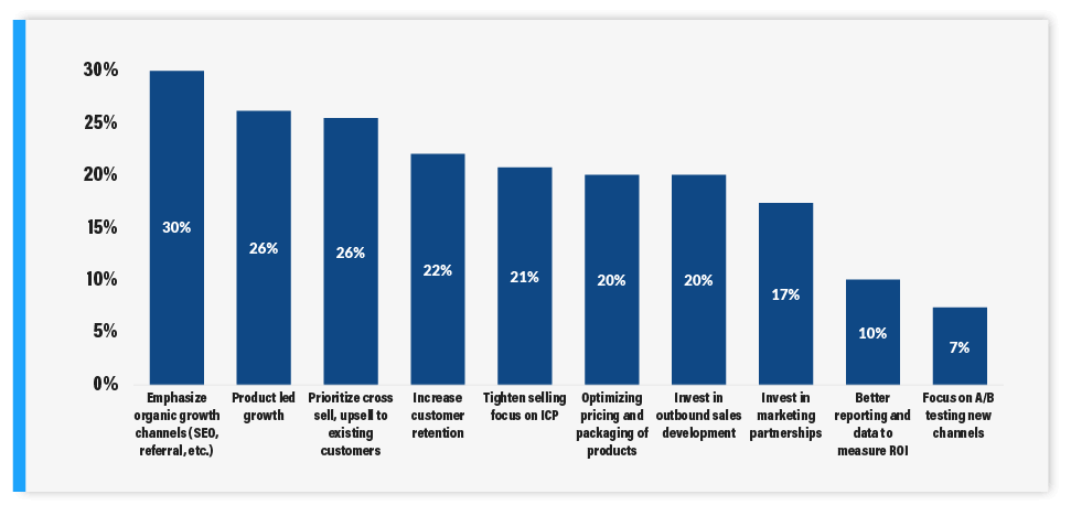 To drive growth during periods of economic uncertainty, founders highlighted Organic Growth Channels (30%), Product Led Growth (26%) and Prioritizing Cross-Sell and Upsell into their Customer Base (26%) as the top three strategies they would pursue. Increasing Customer Retention (22%), Tightening Selling Focus on the Ideal Customer Profile (21%) and Optimizing Pricing and Packaging (20%) also ranked high.