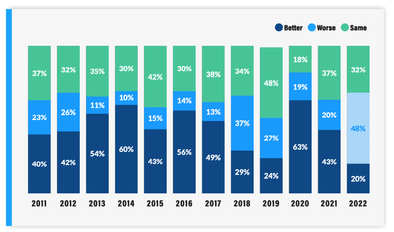 Not surprisingly given this backdrop, founder sentiment regarding the U.S. economy is at an all-time low with nearly 50% believing the economy will be worse in 2023 and only 20% believing it will be better. This represents the highest negative sentiment in the 12 years Mainsail has been conducting this survey.