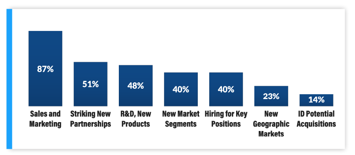 For companies stating they would invest offensively, the biggest areas of planned investment are Sales and Marketing (87%) and Striking New Partnerships (51%); Investments in R&D / Developing More Products was close behind at 48%.