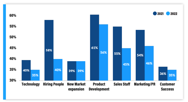Going into 2023, that trend continues. Product Development remains the #1 area of investment with 56% planning to invest in it (down from 61% last year). This is followed by Marketing/PR (46%) and Sales Staff (45%). Despite being down, product development increased in prioritization on a relative basis. The increased importance of product-led growth may be driving this increased investment in product development relative to sales and marketing — a trend that Mainsail has seen across its portfolio.