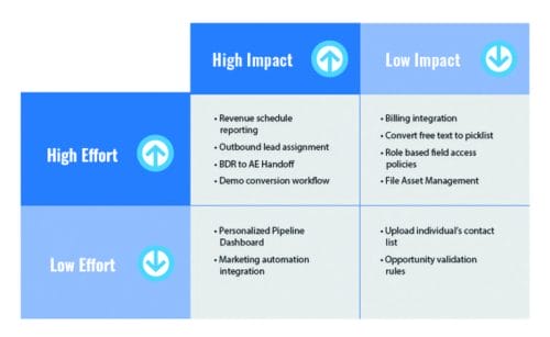 After consolidating business requirements, the RevOps team should look across all revenue-driving functions and determine which projects will have the biggest impact on the business. To help prioritize projects, create a prioritization matrix based on impact and effort and place each project in its respective quadrant, as in the below: